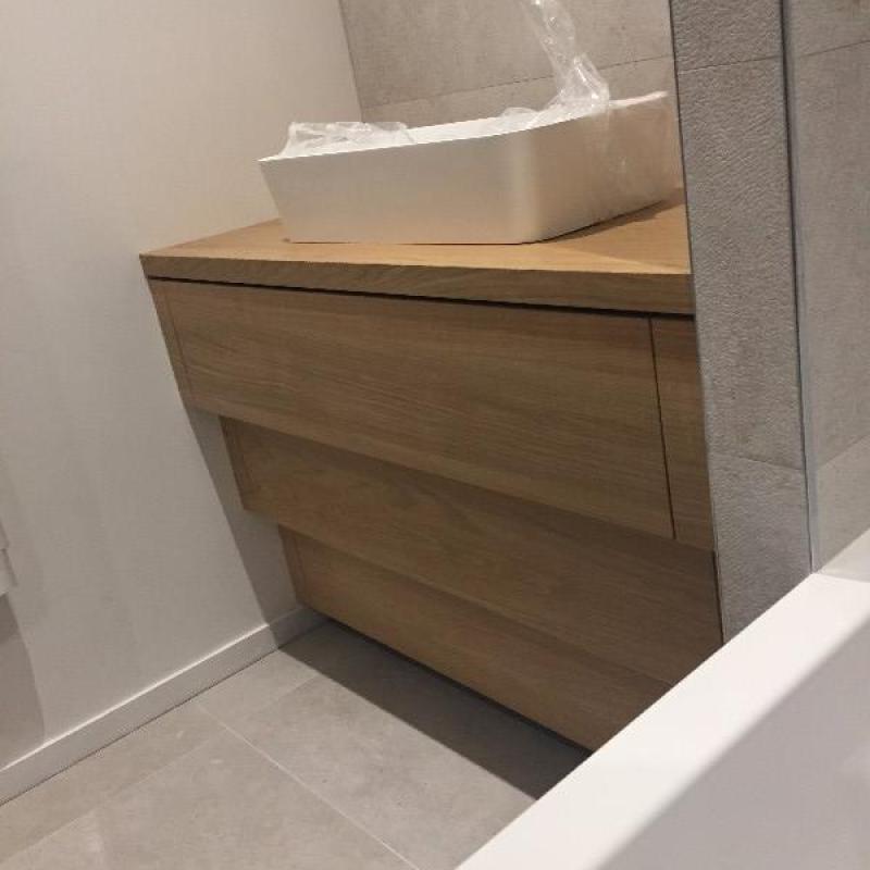 Ce meuble vasque a été réalisé en chêne massif puis recouvert d'un vernis mat pour s'approcher au plus proche de la couleur d'origine de l'essence de bois et ainsi garantir son étanchéité.